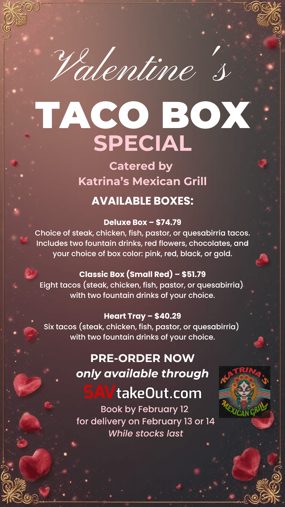 Have Katrina’s Mexican Grill Cater your next event! We offer, Pickup, Delivery & Event Catering Services! Simply Connect with us and submit your Cater Request and we will be back in touch with you right away!